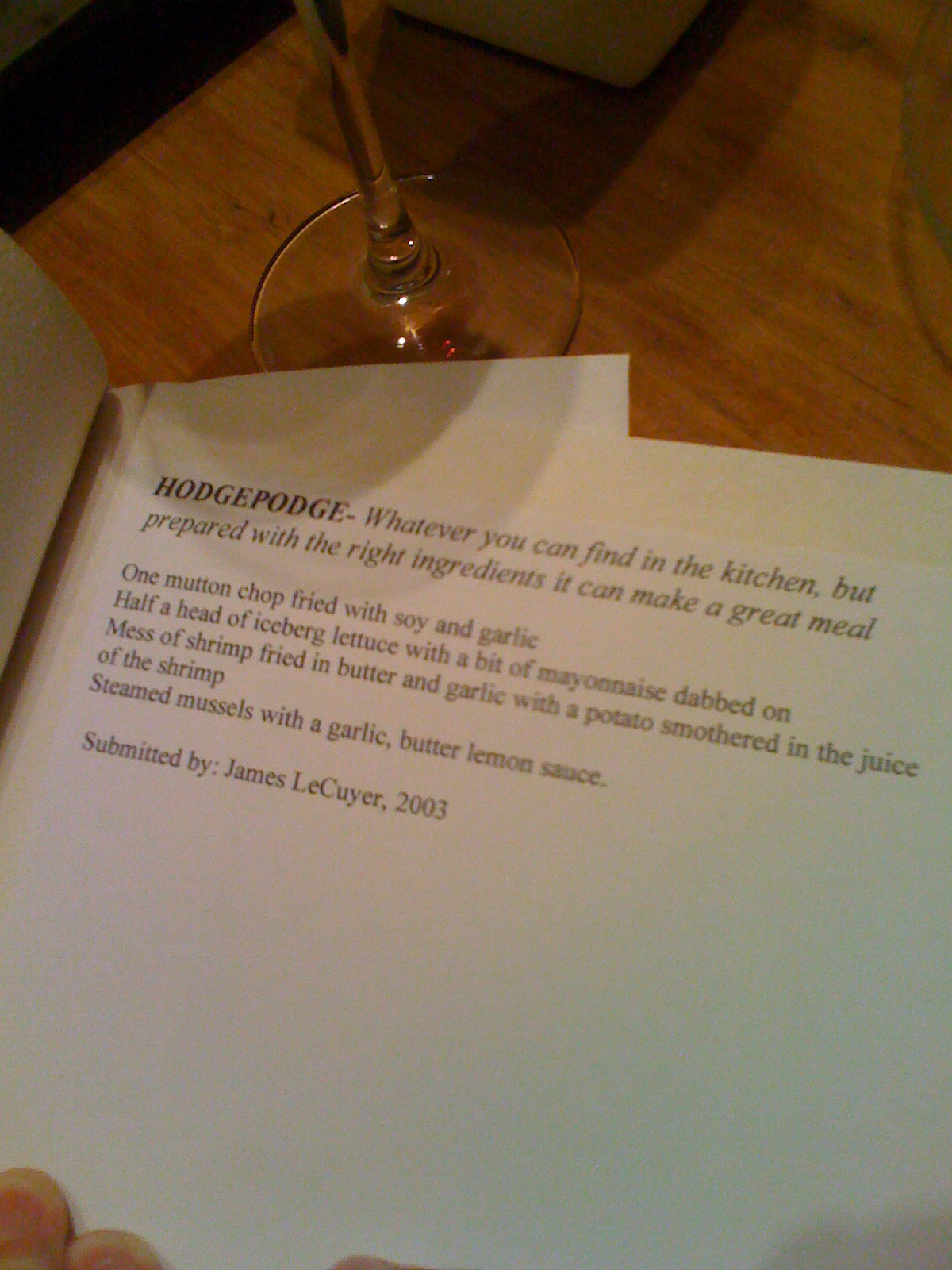 One night back at the retreat, my friend Kathy and I were making dinner and looking through a homemade cookbook in which other writers had left their favorite recipes. Kathy just finished telling me how she loved the challenge of making a fabulous dinner from whatever was left in the fridge. Right then, I turned the page in the cookbook to one that said, “Hodge-podge, whatever you can find in the kitchen but prepared with the right ingredients can make a great meal.” The page described shrimp in butter sauce over a potato and a few other impromptu combinations. I gasped when I saw that the entry was signed James LeCuyer, 2003.