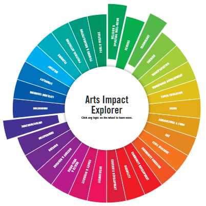 One of the circles I like the most is called the Arts Impact Explorer, but I call it the Rainbow Wheel. I wish it actually spun! Early in my career, I was on the team to help build it and I’m so proud of all the effort that has gone into it since. It goes hand-in-hand with the NEA’s seminal work on the arts ecosystem, which was developed in about the same era of arts policy.