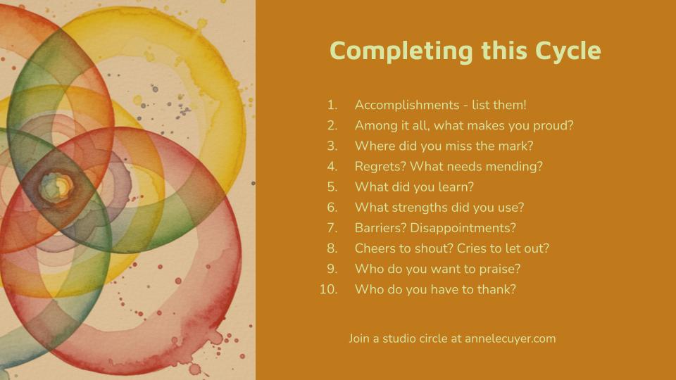 For me, the Completing & Creating cycle is aligned with the winter season, woven among the family time, holiday rituals, and colder weather. Reflecting back, the questions evoke gratitude, affirm limits, and tend to relationships. Looking forward, the opportunity is to carry on from the sacred center of somewhere in a somewhat sensible way.